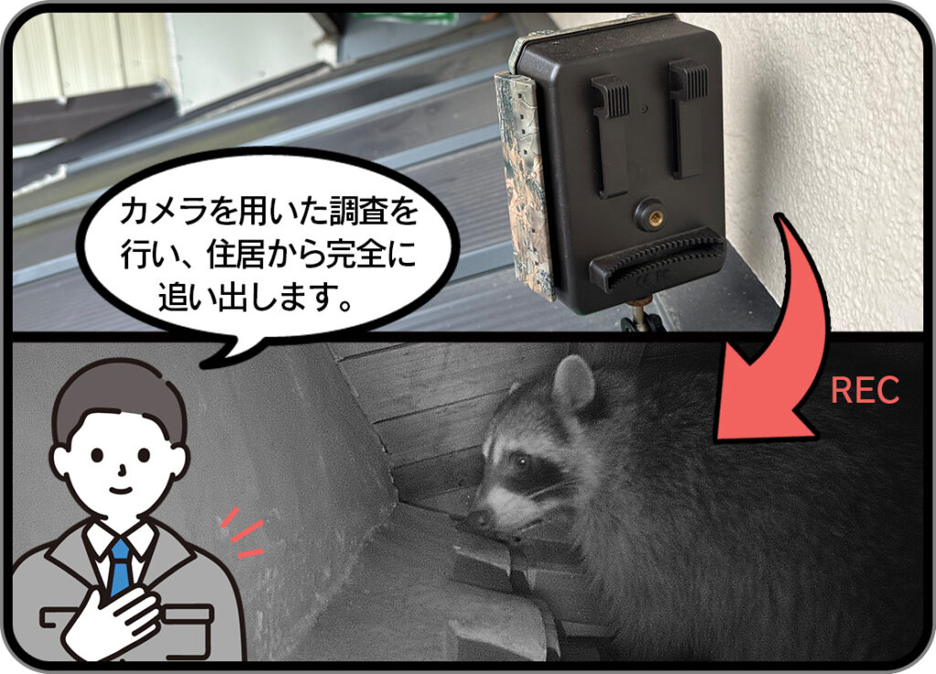 駆除は、対象動物を捕まえ、排除するやり方ですが、一時的な解決にしかならず、新しい個体が発生すれば再発してしまいます。
