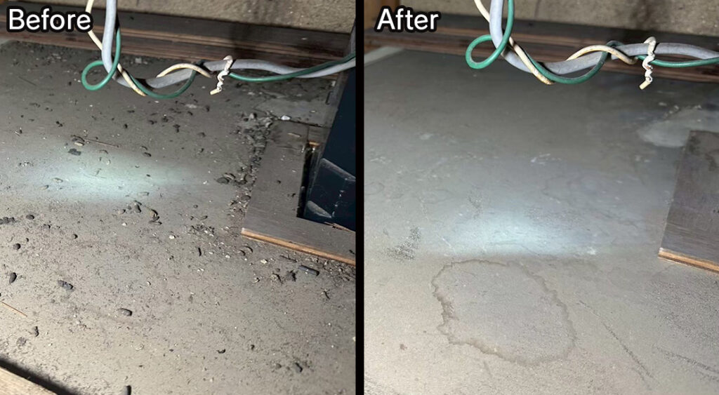 ネズミが残したフンや尿は感染症リスクを伴います。感染症予防の観点からも、防除が確認できた後の工程として、お住まいの清掃と消毒を行います。